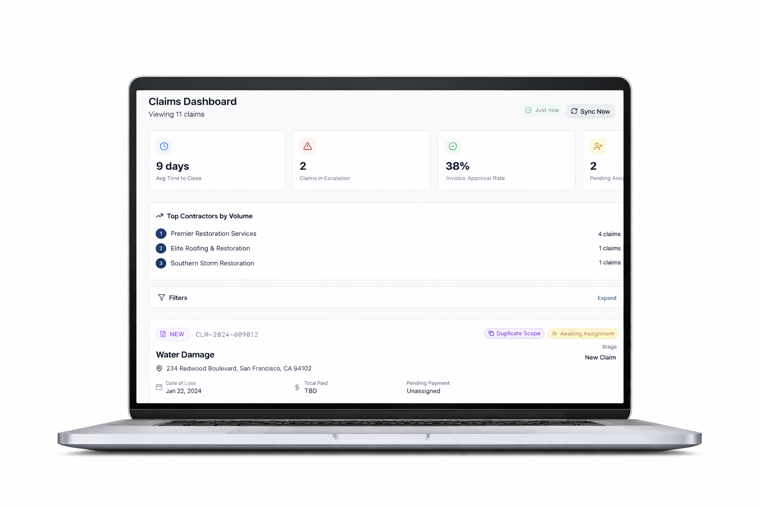 Hive overlays your existing ecosystem (Guidewire/Duck Creek, Xactimate, CRM/LOS, vendor tools) to create a single operational view of every claim—status, timeline, documents, financials, and assignments—without rip-and-replace